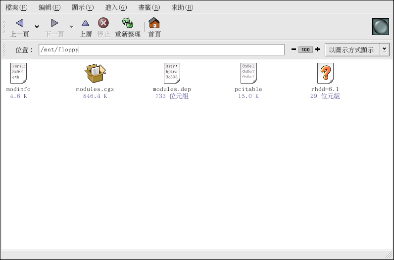 現在這個磁碟片已經被掛載了,所以可以使用它來複製或寫入檔案。 您可以使用它來開啟、儲存以及複製檔案,就像您在硬碟上所做的一樣。 您甚至可以在 Nautilus(如 圖形 4-1 所示) 或 Konqueror 中探索這磁碟片的內容。