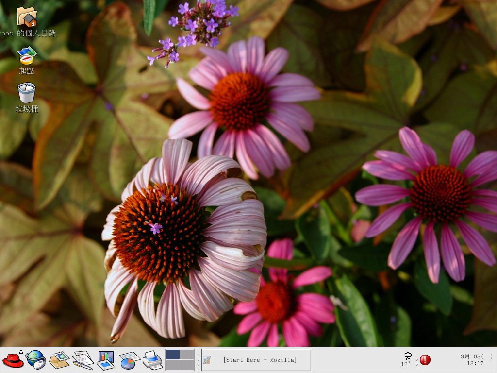 背景圖案偏好設定 工具讓您從所提供影像之目錄(/usr/share/backgrounds/images/) 載入一個新的背景圖案。 您也可以從自己的影像目錄拖曳一個影像到這個視窗。 有許多種其他的選項可用來顯示您的背景圖案,『桌布方式鋪排』 的選項會以多個您所選擇的影像鋪排您的桌面,假如您使用一個小的影像或是使用從 /usr/share/backgrounds/tiles/ 目錄中的鋪排(或圖樣)影像,或者是從您自己的影像收集。 『中央顯示 選項將放置您的影像在桌面的中心位置,並以預設的桌面顏色填滿其餘的桌面空間。 如要使用影像來填滿整個桌面(不鋪排顯示),請使用 『依比例縮放』 或 『不依比例伸展』 選項。 圖形 2-11 顯示一個含有花與植物的背景圖案被伸展以填滿整個桌面。