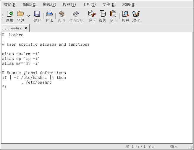 在啟動 gedit 程式後,您將會看到一個空白的編輯區域,您可以馬上開始使用 gedit,或點選 開啟 的按鈕來找出您想編輯的純文字檔案。 該檔案便會載入到如 圖形 9-8 所示的編輯區域。 您可以點選並捲動視窗右側的捲動軸來瀏覽檔案,並且可以上下移動您的滑鼠,或者使用方向鍵來逐行檢視該文字檔。 也可以使用