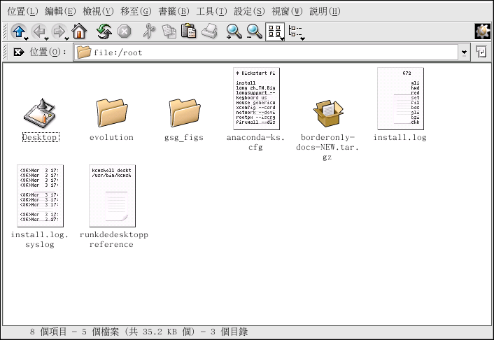 Konqueror 將會在您的桌面上開啟一個視窗,在其中您可以瀏覽您的家目錄以及整個 Red Hat Linux 檔案系統。 在瀏覽過後,您可以點選在工具列上的 首頁 按鈕來回到您的家目錄。