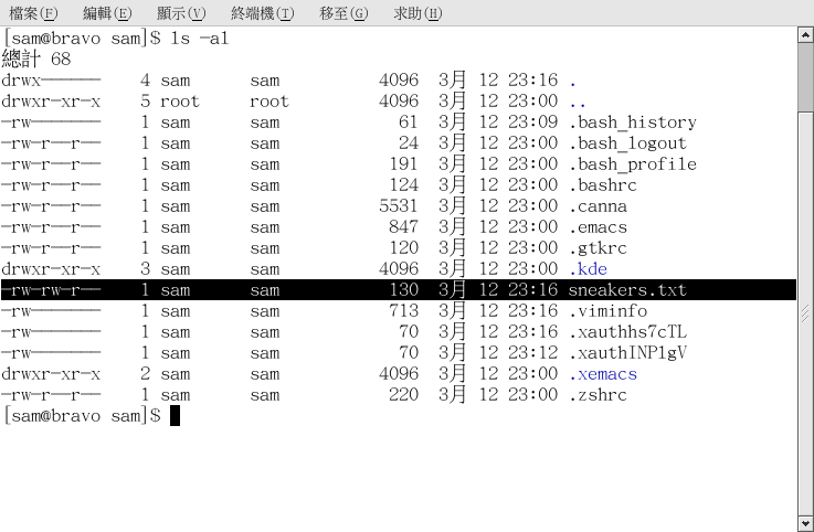 這裡提供了很多的資訊。 您可以看到誰可以讀取(r)、誰可以寫入(w) 這個檔案, 以及誰建立這個檔案(sam),還有擁有者屬於哪一個群組(sam)。 還記得嗎,您所屬群組的名稱是與您的登入名稱相同的。