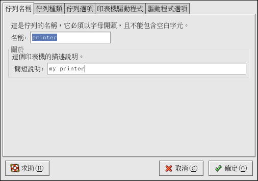 如要重新命名一部印表機或更改它的簡短說明,請更改 『佇列名稱』 標簽頁中的資料。 點選 確定 以回到主要的視窗,您就會發現印表機清單中的印表機名稱已經變更了。 點選 套用 的按鈕來儲存變更並重新啟動列印系統程式。