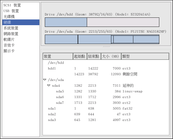 在面板上選擇 『硬碟』 並從所顯示的 『磁碟資訊』 中找出您的 Windows 分割區。 Windows 分割區通常會使用 FAT 或 FAT32 檔案系統類型。 這種檔案系統類型可掛載在 Linux 中以讀取; 然而假如您的 Windows 分割區使用 NTFS,您則無法掛載與讀取它,因為 Red Hat Linux 並不支援 NTFS 檔案系統。 請注意您 Windows 分割區上的 『裝置』 資訊,因為這就是您將要掛載來存取 Windows 上之資料的裝置。