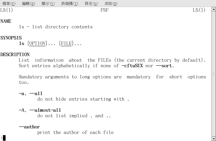 藉由輸入指令 man 加上執行檔的名稱,便可在 shell 提示符號下存取 Man Pages。 舉例來說,如要閱讀 ls 指令的 man pages,請輸入以下指令: