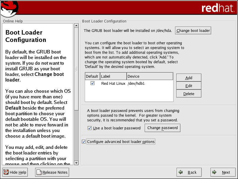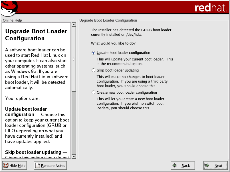 Create new boot loader configuration — Choose this option if you want to create a new boot loader for your system. If you currently have LILO and want to switch to GRUB, or if you have been using boot diskettes to boot your Red Hat Linux system and want to use a software boot loader such as GRUB or LILO, you will want to create a new boot loader configuration (see Section A.4.1 Creating a New Boot Loader Configuration for more information).