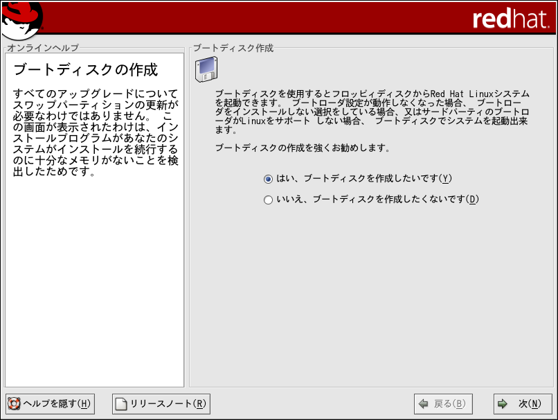 ¥Ö¡¼¥È¥Ç¥£¥¹¥¯¤ÎºîÀ®¤ò¶¯¤¯¿ä¾©¤·¤Þ¤¹¡£ ¤Ê¤ó¤é¤«¤ÎÍýͳ¤Ç¡¢GRUB¡¢LILO ¤Þ¤¿¤Ï¾¼Ò¤Î¥Ö¡¼¥È¥í¡¼¥À¤ò»ÈÍѤ·¤Æ¤â ¥·¥¹¥Æ¥à¤¬Àµ¾ï¤Ëµ¯Æ°¤·¤Ê¤¤¾ì¹ç¤Ï¡¢ ¥Ö¡¼¥È¥Ç¥£¥¹¥¯¤ÇRed Hat Linux¥·¥¹¥Æ¥à¤òÀµ¾ï¤Ë µ¯Æ°¤Ç¤¤Þ¤¹¡£