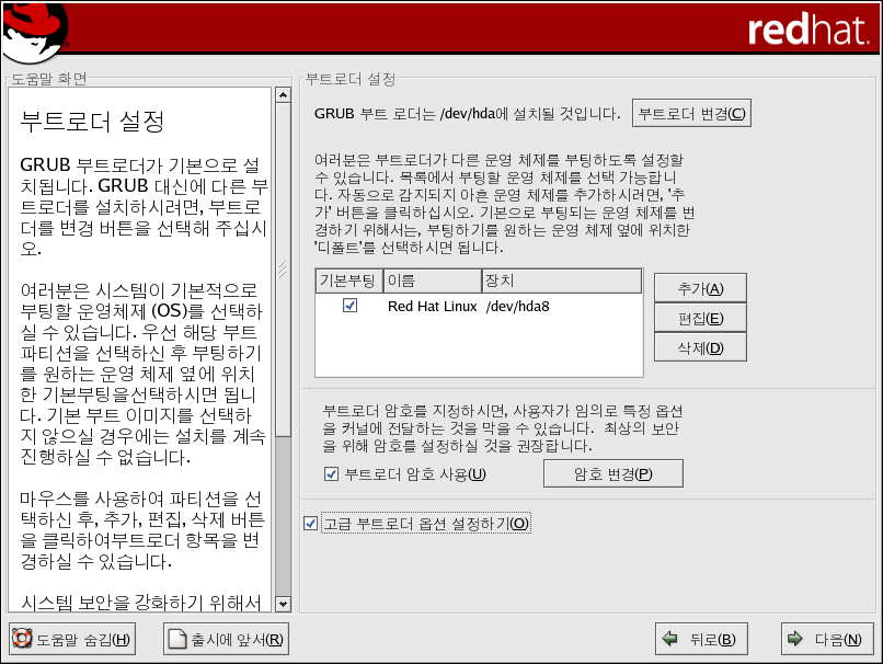 MBRÀÌ ÀÌ¹Ì ´Ù¸¥ ¿î¿µ üÁ¦ ·Î´õ (¿¹, System Commander)¸¦ ½ÃÀÛÇÏÁö ¾Ê¾Ò´Ù¸é, MBR¿¡ ºÎÆ®·Î´õ¸¦ ¼³Ä¡ÇÏ½Ç °ÍÀ» ±ÇÀåÇÕ´Ï´Ù. MBRÀº ÄÄÇ»ÅÍÀÇ BIOS¿¡ ÀÇÇØ ÀÚµ¿À¸·Î ·ÎµåµÇ´Â Á¤º¸·Î¼ ÇÏµå µå¶óÀ̺êÀÇ Ã¹¹øÂ° ¼½ÅÍ¿¡ ÀúÀåµÇ¾î ÀÖ½À´Ï´Ù. ºÎÆ®·Î´õ´Â ºÎÆ® °úÁ¤À» Á¦¾îÇϴ ù ÁöÁ¡ÀÌ MBRÀÔ´Ï´Ù. ºÎÆ®·Î´õ¸¦ MBR¿¡ ¼³Ä¡ÇϽøé, ÄÄÇ»ÅÍ ºÎÆÃ½Ã GRUB (¶Ç´Â LILO)°¡ ºÎÆ® ÇÁ·ÒÇÁÆ®¿¡ ³ªÅ¸³³´Ï´Ù. ±× ÈÄ ¿©·¯ºÐÀº Red Hat Linux³ª ´Ù¸¥ ¿î¿µ üÁ¦¸¦ ¼±ÅÃÇÏ¿© ºÎÆÃÇÏ½Ç ¼ö ÀÖ½À´Ï´Ù.