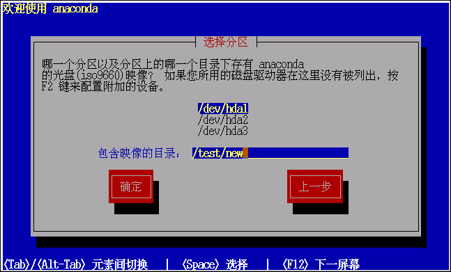 输入包含 Red Hat ISO 映像的分区设备名。其中还有一个字段标为「包含映像的目录」。如果 ISO 映像不在该分区的根(顶级)目录中,请输入到达该映像的全路径(譬如,如果 ISO 映像在 /test/new 中,你应该输入 /test/new)。
