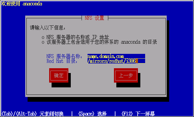 如果 NFS 服务器导出的是 Red Hat Linux 安装树的镜像,输入包含 RedHat 目录的目录(如果你不知道该目录的路径,请向你的系统管理员咨询)。譬如,如果你的 NFS 服务器包含目录 /mirrors/redhat/i386/RedHat,请输入 /mirrors/redhat/i386。