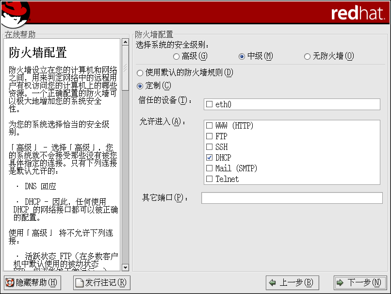 启用这些选项将允许具体指定的服务穿过防火墙。注意:在工作站类型安装中,大多数这类服务在系统内没有被安装。