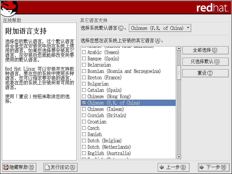 要在你的系统上使用多种语言,具体指定要安装的语言,或者选择在你的 Red Hat Linux 系统上安装所有可用语言。