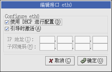 选定网络设备后,点击「编辑」。从弹出的「编辑接口」屏幕上,你可以选择通过 DHCP 来配置网络设备的 IP 地址和子网掩码(若没有选择 DHCP 则手工配置),你可以选择在引导时激活该设备。如果你选择了「引导时激活」,你的网络接口就会在引导时被启动。如果你没有 DHCP 客户的访问权,或者你不能肯定这里该提供什么信息,请和你的网络管理员联系。