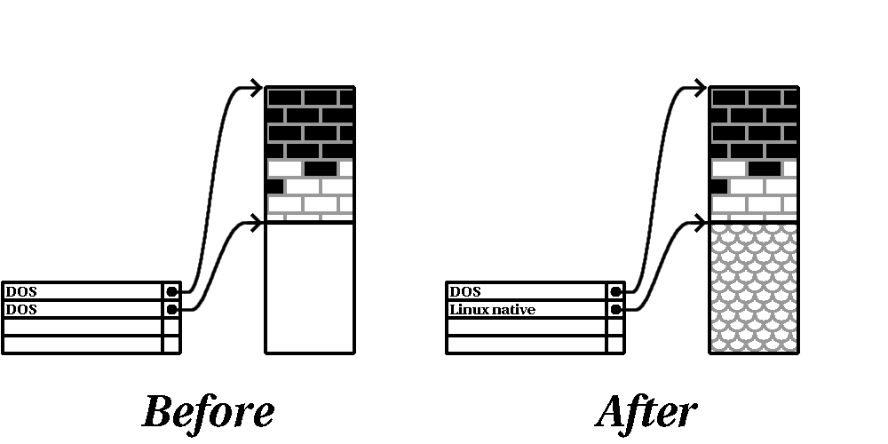 在這種情況下,也許您有一個或多個分割區已不再使用。 或許您曾經使用另一個作業系統,而您分配給它的分割區已似乎不會再被使用到。 圖形 E-9 圖解說明了如此的情況。