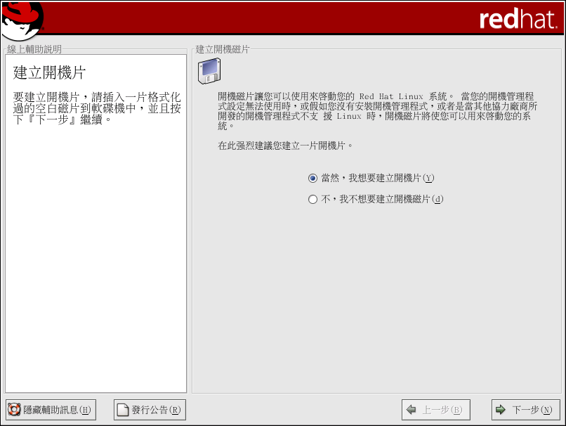 在此強烈建議您建立一片開機磁片。 如果因為某種因素,您的系統無法使用 GRUB、LILO 或其他協力廠商提供的開機管理程式來正確啟動,這個開機磁片會讓您妥善地啟動您的 Red Hat Linux 系統。