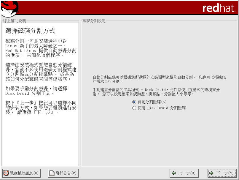 在這個畫面,您可以選擇執行自動分割磁碟或使用 Disk Druid 手動分割磁碟。