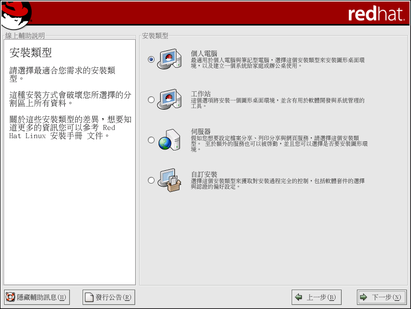 選擇您想要執行的安裝類型 (請看 圖形 3-11)。 Red Hat Linux 讓您可以選擇最適合您需求的安裝類型。 您的選擇有 『個人電腦』、『工作站』、『伺服器』、『自訂安裝』 以及 『升級舊有系統』。