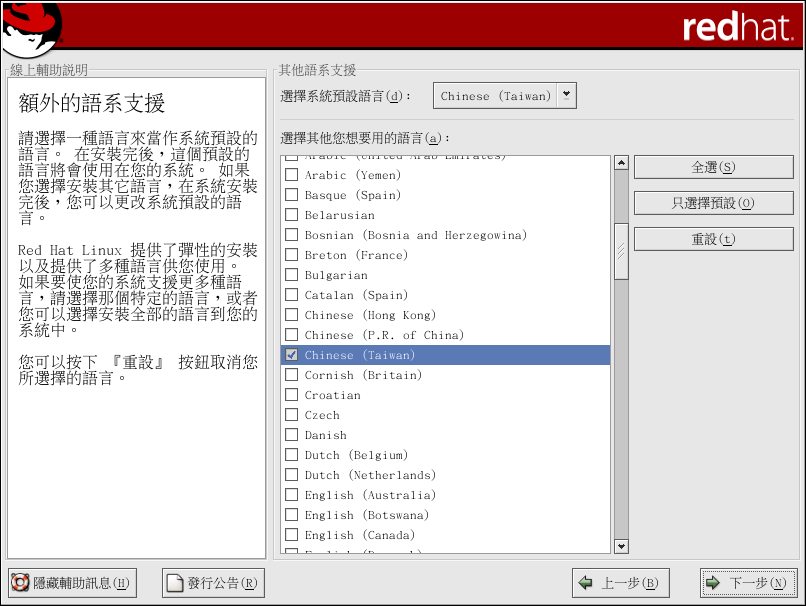要在您的系統上使用一種以上的語言,您必須選擇要安裝的特定語言或選擇全部語言以安裝所有可使用的語言在您的 Red Hat Linux 系統上。