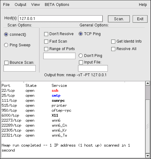 If you were to use the graphical frontend (which can be run by typing /usr/bin/nmapfe at a shell prompt), the results will look similar to the following: